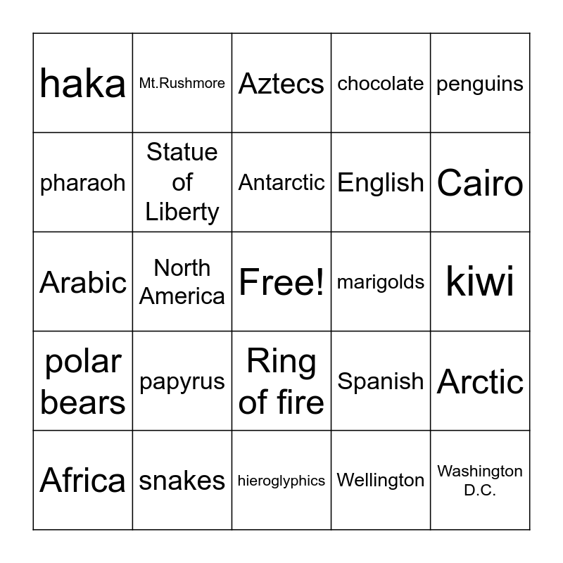 This bingo card has a free space and 29 words: Africa, Oceania, North America, eagle, haka, Aztecs, Statue of Liberty, papyrus, marigolds, snakes, kiwi, Washington D.C., hieroglyphics, Wellington, Cairo, Mexico City, Ring of fire, polar bears, penguins, Arabic, Spanish, Maori, English, pharaoh, chocolate, Mt.Rushmore, Arctic, Antarctic and desert.