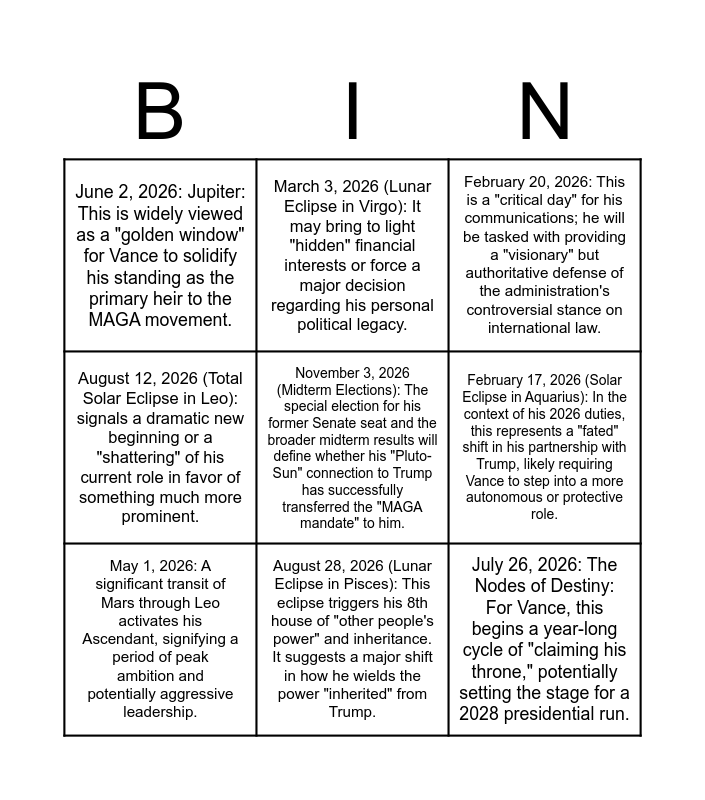This bingo card has a free space and 8 words: February 17, 2026 (Solar Eclipse in Aquarius): In the context of his 2026 duties, this represents a "fated" shift in his partnership with Trump, likely requiring Vance to step into a more autonomous or protective role., February 20, 2026: This is a "critical day" for his communications; he will be tasked with providing a "visionary" but authoritative defense of the administration's controversial stance on international law., March 3, 2026 (Lunar Eclipse in Virgo): It may bring to light "hidden" financial interests or force a major decision regarding his personal political legacy., May 1, 2026: A significant transit of Mars through Leo activates his Ascendant, signifying a period of peak ambition and potentially aggressive leadership., June 2, 2026: Jupiter: This is widely viewed as a "golden window" for Vance to solidify his standing as the primary heir to the MAGA movement., July 26, 2026: The Nodes of Destiny: For Vance, this begins a year-long cycle of "claiming his throne," potentially setting the stage for a 2028 presidential run., August 12, 2026 (Total Solar Eclipse in Leo): signals a dramatic new beginning or a "shattering" of his current role in favor of something much more prominent. and August 28, 2026 (Lunar Eclipse in Pisces): This eclipse triggers his 8th house of "other people's power" and inheritance. It suggests a major shift in how he wields the power "inherited" from Trump..