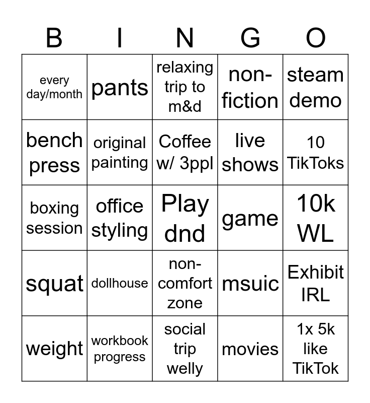 This bingo card has a free space and 24 words: weight, dollhouse, Coffee w/ 3ppl, movies, steam demo, every day/month, pants, relaxing trip to m&d, game, 10k WL, boxing session, original painting, msuic, Exhibit IRL, bench press, workbook progress, social trip welly, non-fiction, 10 TikToks, squat, office styling, non-comfort zone, live shows and 1x 5k like TikTok.