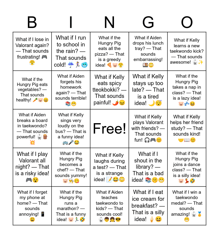 This bingo card has a free space and 32 words: What if I eat ice cream for breakfast? — That is a silly idea! 🍦😆, What if Aiden practices taekwondo every morning? — That sounds strong! 🥋💪, What if Kelly sings very loudly on the bus? — That is a funny idea! 🚌🎤😂, What if the Hungry Pig steals my sandwich? — That sounds bad! 🐷🥪😱, What if I play Valorant all night? — That is a risky idea! 🎮😵, What if Aiden forgets his homework again? — That sounds terrible! 📚😬, What if Kelly learns a new taekwondo kick? — That sounds awesome! 🥋✨, What if the Hungry Pig joins a dance class? — That is a silly idea! 🐷💃🤣, What if I run to school in the rain? — That sounds cold! ☔🏃♀️🥶, What if Aiden wins a Valorant match? — That sounds exciting! 🎮🔥😄, What if Kelly eats spicy tteokbokki? — That sounds painful! 🌶️😖, What if the Hungry Pig eats all the pizza? — That is a greedy idea! 🍕🐷😤, What if I try taekwondo for the first time? — That sounds brave! 🥋🙂, What if Aiden sleeps in class? — That is a bad idea! 💤🏫🙄, What if Kelly plays Valorant with friends? — That sounds fun! 🎧🎮😊, What if the Hungry Pig wears sunglasses? — That is a cool idea! 🐷🕶️😎, What if I forget my phone at home? — That sounds annoying! 📱😩, What if Aiden breaks a board in taekwondo? — That sounds powerful! 🥋🪵💥, What if Kelly laughs during a test? — That is a strange idea! 📝😂😳, What if the Hungry Pig becomes a chef? — That sounds yummy! 🐷👨🍳😋, What if I shout in the library? — That is a bad idea! 📚🤫😬, What if Aiden plays Valorant too seriously? — That sounds stressful! 🎮😠, What if Kelly helps her friend study? — That sounds kind! 🤝📖😊, What if the Hungry Pig runs a marathon? — That is a funny idea! 🐷🏃♂️🤣, What if I win a taekwondo medal? — That sounds amazing! 🥋🏅😁, What if Aiden drops his lunch tray? — That sounds embarrassing! 🍱😳, What if Kelly stays up too late? — That is a tired idea! 🌙😴, What if the Hungry Pig eats vegetables? — That sounds healthy! 🥕🐷😄, What if I lose in Valorant again? — That sounds frustrating! 🎮😤, What if Aiden teaches taekwondo to kids? — That sounds cool! 🥋👦👧😎, What if Kelly dances during break time? — That sounds fun! 🎶💃😄 and What if the Hungry Pig takes a nap in class? — That is a lazy idea! 🐷💤😆.