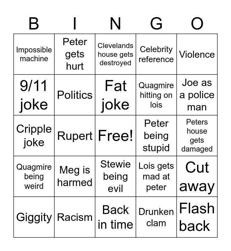 This bingo card has a free space and 24 words: Meg is harmed, Racism, Fat joke, Giggity, Violence, Impossible machine, 9/11 joke, Peter gets hurt, Peter being stupid, Stewie being evil, Quagmire hitting on lois, Cripple joke, Lois gets mad at peter, Cut away, Politics, Drunken clam, Peters house gets damaged, Clevelands house gets destroyed, Joe as a police man, Rupert, Flash back, Quagmire being weird, Celebrity reference and Back in time.