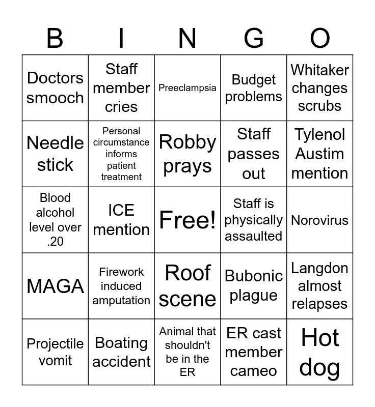 This bingo card has a free space and 25 words: Firework induced amputation, Animal that shouldn't be in the ER, Robby prays, Projectile vomit, Whitaker changes scrubs, Doctors smooch, Needle stick, Staff member cries, Staff is physically assaulted, Roof scene, Staff passes out, Blood alcohol level over .20, Bubonic plague, Langdon almost relapses, Personal circumstance informs patient treatment, Mild incident spirals into major disaster, Norovirus, Preeclampsia, Tylenol Austim mention, ICE mention, Hot dog, Boating accident, MAGA, Budget problems and ER cast member cameo.