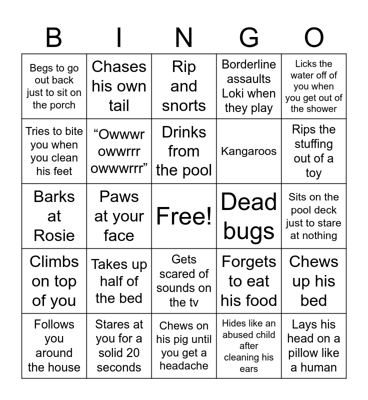 This bingo card has a free space and 24 words: Takes up half of the bed, Stares at you for a solid 20 seconds, Drinks from the pool, Follows you around the house, Licks the water off of you when you get out of the shower, Begs to go out back just to sit on the porch, Tries to bite you when you clean his feet, Chases his own tail, Dead bugs, Gets scared of sounds on the tv, Kangaroos, Barks at Rosie, Forgets to eat his food, Chews up his bed, “Owwwr owwrrr owwwrrr”, Hides like an abused child after cleaning his ears, Sits on the pool deck just to stare at nothing, Rip and snorts, Rips the stuffing out of a toy, Paws at your face, Lays his head on a pillow like a human, Climbs on top of you, Borderline assaults Loki when they play and Chews on his pig until you get a headache.