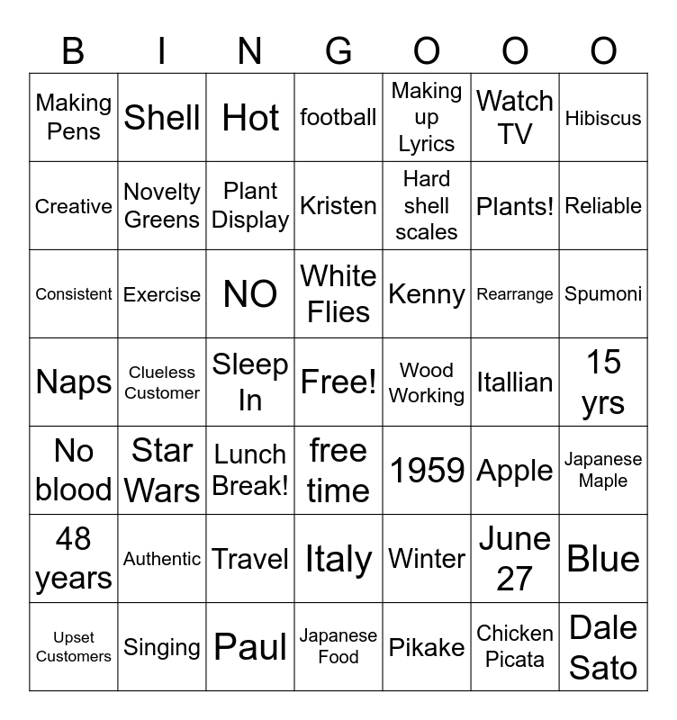This bingo card has a free space and 55 words: Pikake, Spumoni, Poppi, Making Pens, Clueless Customer, Authentic, Hibiscus, Kind, Novelty Greens, Travel, football, Japanese Maple, 15 yrs, Itallian, Upset Customers, No blood, Making up Lyrics, Hard shell scales, Chicken Picata, Plants!, Reliable, Star Wars, Kenny, Hot, Papaya, Creative, Sleep In, Ice Cream, Consistent, Rearrange, Michelle, Apple, Blue, Singing, Watch TV, Kristen, 48 years, Exercise, Dale Sato, Lunch Break!, Shell, Italy, Winter, Amusing, NO, Naps, Paul, 1959, Wood Working, Plant Display, free time, June 27, Japanese Food, White Flies and Black.