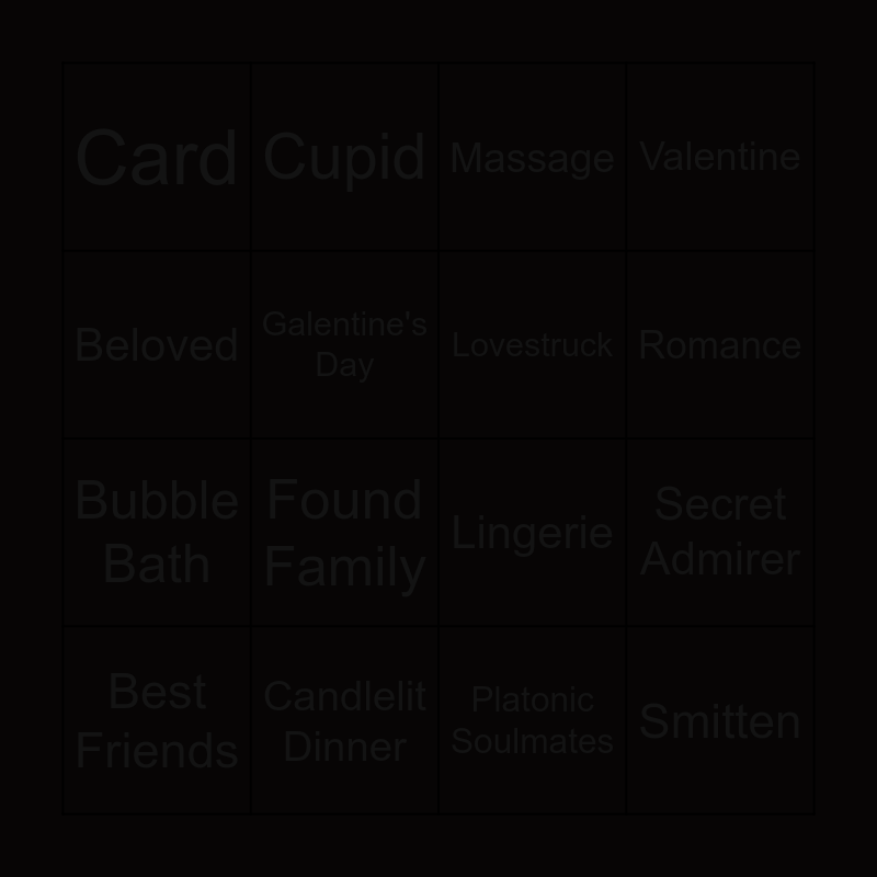 This bingo card has 16 words: Best Friends, Candlelit Dinner, Massage, Valentine, Beloved, Cupid, Lingerie, Secret Admirer, Card, Galentine's Day, Platonic Soulmates, Romance, Bubble Bath, Found Family, Lovestruck and Smitten.