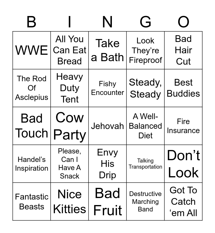 This bingo card has a free space and 43 words: Hot Weapon, Got To Catch ‘em All, Google Translate Fail, Fantastic Beasts, Spy Thriller, Destructive Marching Band, Take a Bath, Epic Trash talk, Bad Hair Cut, Nice Kitties, Look They’re Fireproof, A Well-Balanced Diet, Envy His Drip, Please, Can I Have A Snack, The Perfect Work Week, Bad Fruit, That’s One Hot Ride, Bad Touch, The First iPad, Best Buddies, All You Can Eat Bread, Bad Teddy Bear, We Will Rock You, WWE, That’s One Big Ladder, Fire Insurance, Well, That Was A Waste, You Get Oil, Talking Transportation, Handel’s Inspiration, You Both Get Half, Don’t Look, 1001 Arabian Nights, Cow Party, Time To Leave, From Riches to Rags, Late Night Dinner Party, Standing Room Only, Fishy Encounter, The Rod Of Asclepius, Steady, Steady, “Sticky” Water, Heavy Duty Tent and Cinderella.