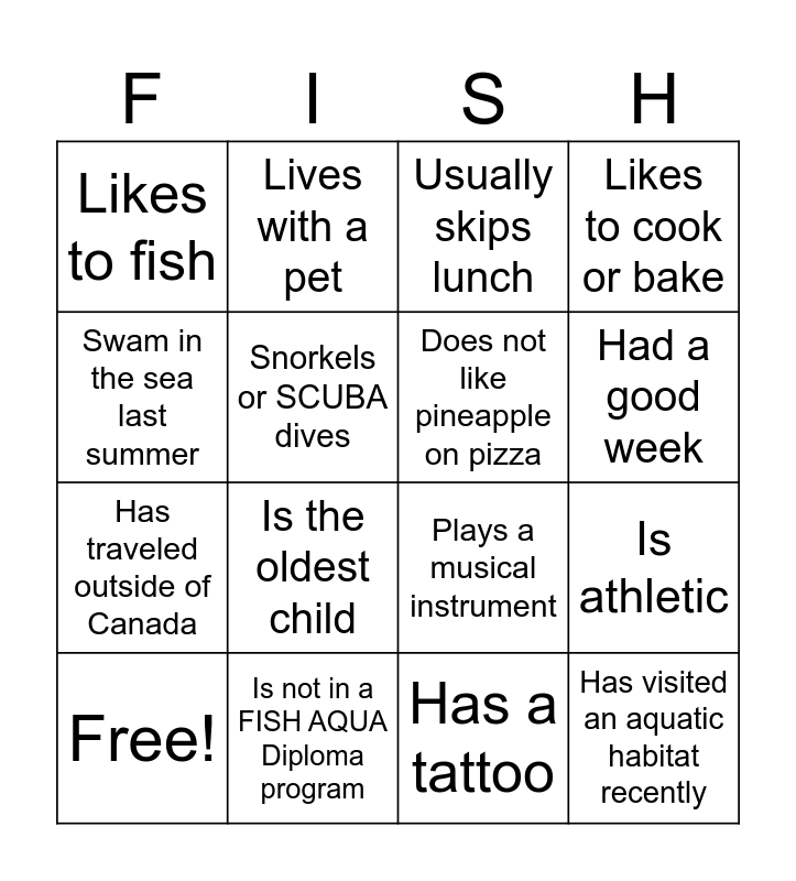 This bingo card has 20 words: Is athletic, Speaks a foreign language fluently, Usually skips lunch, Moved to BC from elsewhere in Canada, Free!, Swam in the sea last summer, Is not in a FISH AQUA Diploma program, Likes to fish, Has traveled outside of Canada, Lives with a pet, Is the oldest child, Plays a musical instrument, Snorkels or SCUBA dives, Has visited an aquatic habitat recently, Does not like pineapple on pizza, Has a PT job, Had a good week, Likes to cook or bake, Has a tattoo and Free.