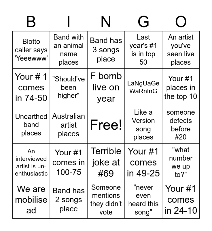 This bingo card has a free space and 24 words: Your #1 comes in 100-75, Band has 2 songs place, F bomb live on year, We are mobilise ad, An artist you've seen live places, Blotto caller says 'Yeeewww', Your # 1 comes in 74-50, Band with an animal name places, Like a Version song places, Terrible joke at #69, LaNgUaGe WaRnInG, Unearthed band places, Your #1 comes in 49-25, "what number we up to?", "Should've been higher", "never even heard this song", someone defects before #20, Band has 3 songs place, Your #1 places in the top 10, Australian artist places, Your #1 comes in 24-10, An interviewed artist is un- enthusiastic, Last year's #1 is in top 50 and Someone mentions they didn't vote.