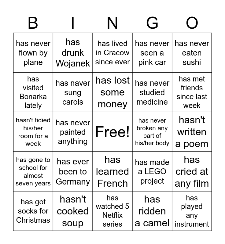 This bingo card has a free space and 24 words: has ever been to Germany, hasn't cooked soup, has lost some money, has got socks for Christmas, has never eaten sushi, has never flown by plane, has visited Bonarka lately, has drunk Wojanek, has never broken any part of his/her body, has learned French, has never studied medicine, hasn't tidied his/her room for a week, has made a LEGO project, has cried at any film, has naver sung carols, has ridden a camel, hasn't written a poem, has lived in Cracow since ever, has met friends since last week, has never painted anything, has played any instrument, has gone to school for almost seven years, has never seen a pink car and has watched 5 Netflix series.