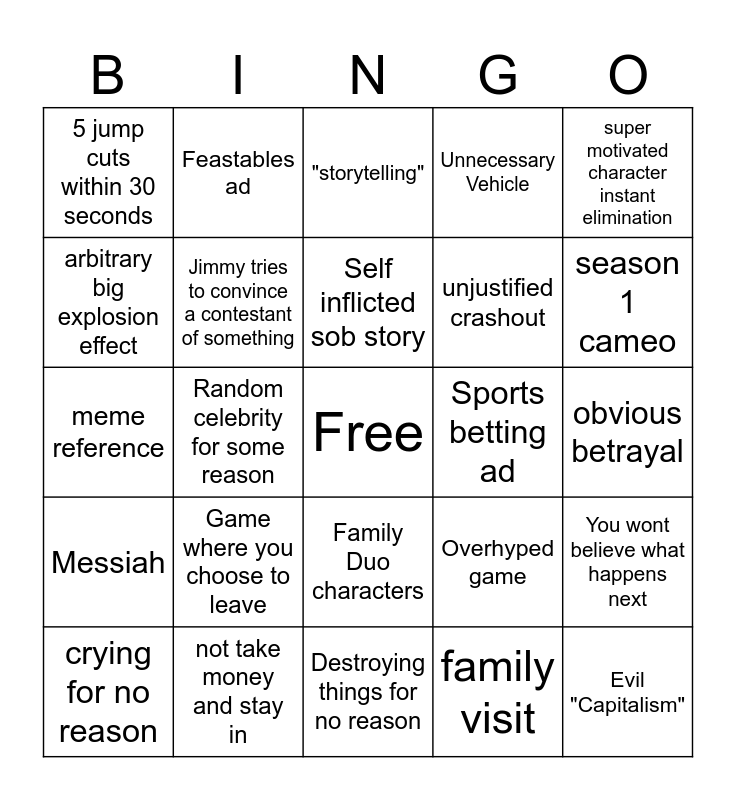 This bingo card has a free space and 24 words: Game where you choose to leave, not take money and stay in, Self inflicted sob story, crying for no reason, super motivated character instant elimination, 5 jump cuts within 30 seconds, arbitrary big explosion effect, Feastables ad, Sports betting ad, Family Duo characters, unjustified crashout, meme reference, Overhyped game, You wont believe what happens next, Jimmy tries to convince a contestant of something, family visit, obvious betrayal, "storytelling", season 1 cameo, Random celebrity for some reason, Evil "Capitalism", Messiah, Unnecessary Vehicle and Destroying things for no reason.