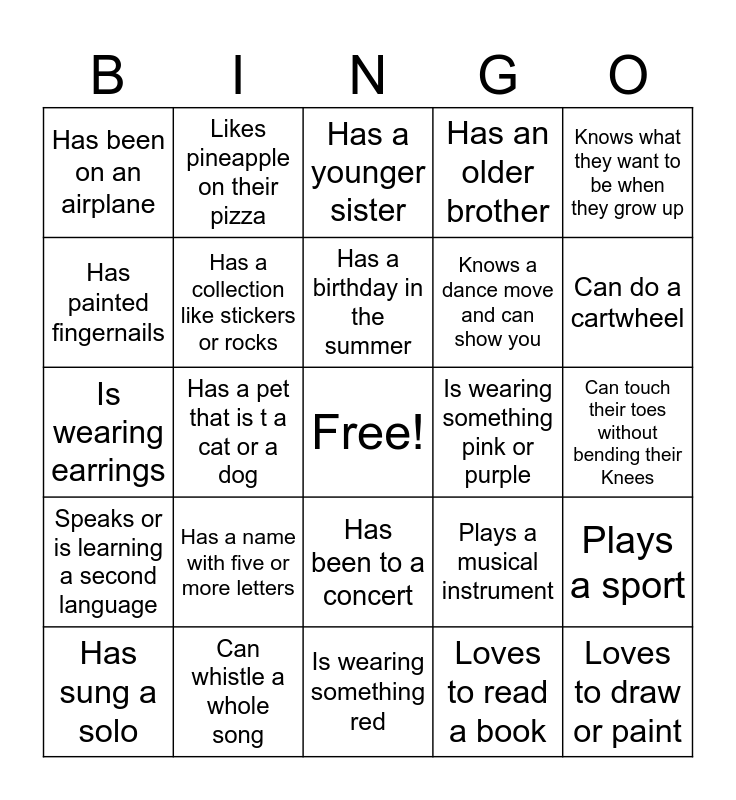 This bingo card has a free space and 24 words: Has a name with five or more letters, Can whistle a whole song, Has a birthday in the summer, Has sung a solo, Knows what they want to be when they grow up, Has been on an airplane, Has painted fingernails, Likes pineapple on their pizza, Is wearing something pink or purple, Has been to a concert, Knows a dance move and can show you, Is wearing earrings, Plays a musical instrument, Plays a sport, Has a collection like stickers or rocks, Loves to read a book, Can touch their toes without bending their Knees, Has a younger sister, Can do a cartwheel, Has a pet that is t a cat or a dog, Loves to draw or paint, Speaks or is learning a second language, Has an older brother and Is wearing something red.