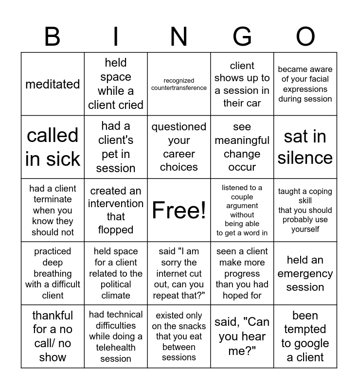 This bingo card has a free space and 29 words: thankful for a no call/ no show, waived a no show fee, created an intervention that flopped, had a client yell at you, meditated, recognized countertransference, had a client's pet in session, held space for a client related to the political climate, listened to a couple argument without being able to get a word in, had technical difficulties while doing a telehealth session, taught a coping skill that you should probably use yourself, been tempted to google a client, existed only on the snacks that you eat between sessions, said, "Can you hear me?", sat in silence, refilled your caffeine source between sessions, said "I am sorry the internet cut out, can you repeat that?", practiced deep breathing with a difficult client, became aware of your facial expressions during session, had a client terminate when you know they should not, seen a client make more progress than you had hoped for, had an intervention go successfully, see meaningful change occur, called in sick, client shows up to a session in their car, held space while a client cried, held an emergency session, questioned your career choices and received sentiment of appreciation from a client.