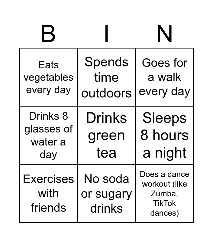 This bingo card has a free space and 8 words: Sleeps 8 hours a night, Goes for a walk every day, Spends time outdoors, Exercises with friends, Eats vegetables every day, Does a dance workout (like Zumba, TikTok dances), Drinks 8 glasses of water a day and No soda or sugary drinks.