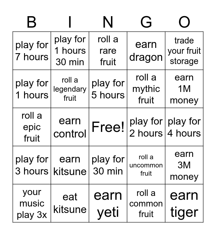 This bingo card has a free space and 24 words: earn kitsune, eat kitsune, play for 5 hours, your music play 3x, trade your fruit storage, play for 7 hours, play for 1 hours, play for 1 hours 30 min, play for 2 hours, play for 30 min, roll a mythic fruit, roll a epic fruit, roll a uncommon fruit, earn 3M money, roll a legendary fruit, roll a common fruit, play for 4 hours, roll a rare fruit, earn 1M money, earn control, earn tiger, play for 3 hours, earn dragon and earn yeti.