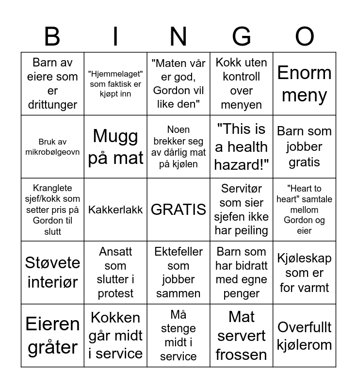 This bingo card has a free space and 24 words: Ansatt som slutter i protest, Kokken går midt i service, Noen brekker seg av dårlig mat på kjølen, Eieren gråter, Enorm meny, Barn av eiere som er drittunger, Bruk av mikrobølgeovn, "Hjemmelaget" som faktisk er kjøpt inn, Servitør som sier sjefen ikke har peiling, Ektefeller som jobber sammen, "This is a health hazard!", Kranglete sjef/kokk som setter pris på Gordon til slutt, Barn som har bidratt med egne penger, Kjøleskap som er for varmt, Mugg på mat, Mat servert frossen, "Heart to heart" samtale mellom Gordon og eier, "Maten vår er god, Gordon vil like den", Barn som jobber gratis, Kakkerlakk, Overfullt kjølerom, Støvete interiør, Kokk uten kontroll over menyen and Må stenge midt i service.