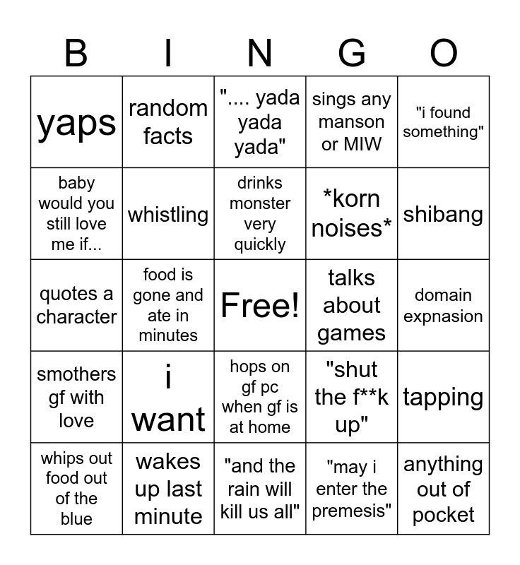 This bingo card has a free space and 24 words: i want, wakes up last minute, drinks monster very quickly, whips out food out of the blue, "i found something", yaps, baby would you still love me if..., random facts, talks about games, hops on gf pc when gf is at home, *korn noises*, quotes a character, "shut the f**k up", tapping, whistling, "may i enter the premesis", domain expnasion, ".... yada yada yada", shibang, food is gone and ate in minutes, anything out of pocket, smothers gf with love, sings any manson or MIW and "and the rain will kill us all".