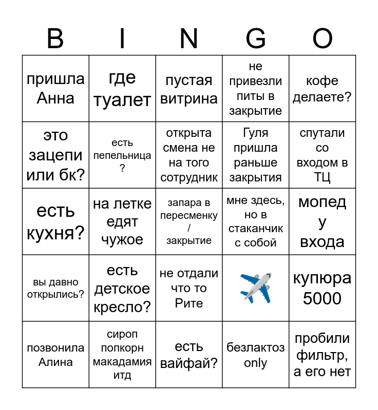 This bingo card has 25 words: есть детское кресло?, есть вайфай?, открыта смена не на того сотрудник, позвонила Алина, кофе делаете?, пришла Анна, это зацепи или бк?, где туалет, мне здесь, но в стаканчик с собой, не отдали что то Рите, Гуля пришла раньше закрытия, есть кухня?, ✈️, купюра 5000, есть пепельница ?, пробили фильтр, а его нет, мопед у входа, пустая витрина, спутали со входом в ТЦ, на летке едят чужое, запара в пересменку / закрытие, сироп попкорн макадамия итд, вы давно открылись?, не привезли питы в закрытие and безлактоз only.