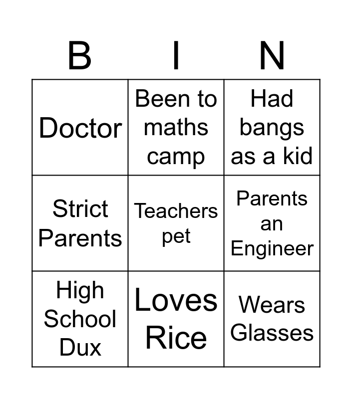 This bingo card has a free space and 8 words: Parents an Engineer, Had bangs as a kid, Been to maths camp, High School Dux, Doctor, Wears Glasses, Strict Parents and Loves Rice.