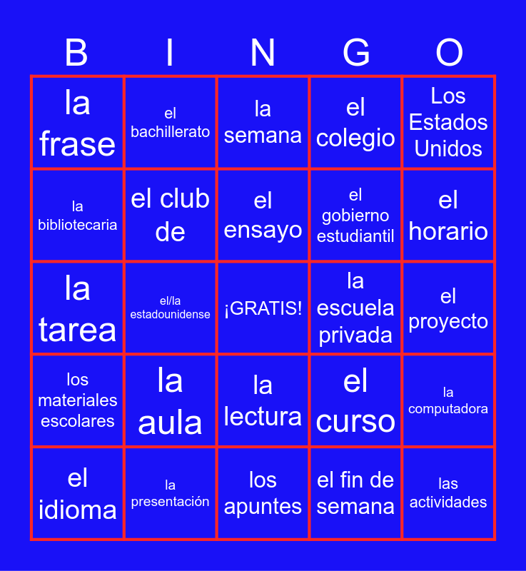 This bingo card has a free space and 47 words: el año escolar, las actividades, la asignatura, los apuntes, la aula, la ayuda, el bachillerato, la beca, la bibliotecaria, la clase de, el club de, el colegio, la computadora, el curso, el día, el director/la directora, el ensayo, la escuela privada, la escuela pública, Los Estados Unidos, el/la estadounidense, el fin de semana, la frase, el gobierno estudiantil, la hora, el horario, el idioma, los jóvenes, la lectura, los materiales escolares, la mochila, la nota, la página, la palabra, la pantalla, la presentación, el proyecto, la prueba, el repaso, la sala de estudio, la sala, la semana, la tarea, el tema, el uniforme, la universidad and la vida.