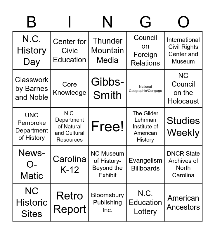 This bingo card has a free space and 48 words: Ackland Museum of Art, American Ancestors, Bill of Rights Institue, Bloomsbury Publishing Inc., Carolina K-12, Center for Advancing Pluralism, Center for Civic Education, Cherokee Historical Association, Classwork by Barnes and Noble, Constituting America, Core Knowledge, Council on Foreign Relations, DNCR State Archives of North Carolina, Evangelism Billboards, Exploros, Founding Forward, Gibbs-Smith, The Gilder Lehrman Institute of American History, Institute for Curriculum Services, International Civil Rights Center and Museum, N.C. Department of Natural and Cultural Resources, N.C. Education Lottery, N.C. History Day, National Geographic/Cengage, NC American Indian Heritage Commission, NC Council on the Holocaust, NC Historic Sites, NC History Center on the Civil War, Emancipation, and Reconstruction, NC Museum of History- Beyond the Exhibit, News-O-Matic, NewsBank inc., Next Gen Personal Finance, North Carolina Museum of Art, Perfection Learning, Retro Report, Social Studies School Service, Sphere Education Initiatives, Studies Weekly, Teaching Asia Network of the Carolinas - UNC, The American Exchange Program, The DBQ Project, The Stan Greenspon Holocaust and Social Justice Education Center, Thunder Mountain Media, Trust for the National Mall, UNC Pembroke Department of History, UNC WorldView, WestED and Woodson Center.