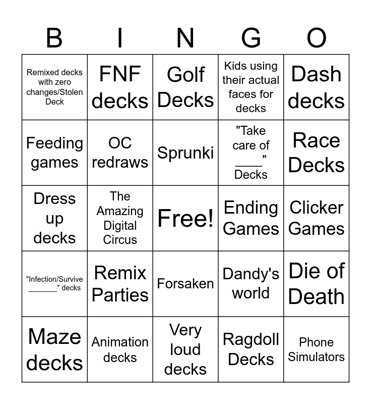 This bingo card has a free space and 24 words: Remix Parties, Animation decks, Sprunki, Maze decks, Dash decks, Remixed decks with zero changes/Stolen Deck, Feeding games, FNF decks, Ending Games, Forsaken, "Take care of ____" Decks, Dress up decks, Dandy's world, Die of Death, OC redraws, Ragdoll Decks, Clicker Games, Golf Decks, Race Decks, The Amazing Digital Circus, Phone Simulators, "Infection/Survive _______" decks, Kids using their actual faces for decks and Very loud decks.