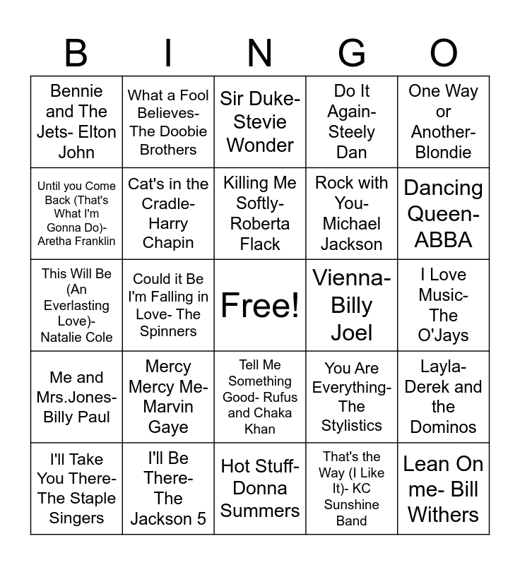 This bingo card has a free space and 24 words: Mercy Mercy Me- Marvin Gaye, I'll Be There- The Jackson 5, Killing Me Softly- Roberta Flack, I'll Take You There- The Staple Singers, One Way or Another- Blondie, Bennie and The Jets- Elton John, Until you Come Back (That's What I'm Gonna Do)- Aretha Franklin, What a Fool Believes- The Doobie Brothers, Vienna- Billy Joel, Tell Me Something Good- Rufus and Chaka Khan, Rock with You- Michael Jackson, This Will Be (An Everlasting Love)- Natalie Cole, You Are Everything- The Stylistics, Layla- Derek and the Dominos, Cat's in the Cradle- Harry Chapin, That's the Way (I Like It)- KC Sunshine Band, I Love Music- The O'Jays, Sir Duke- Stevie Wonder, Dancing Queen- ABBA, Could it Be I'm Falling in Love- The Spinners, Lean On me- Bill Withers, Me and Mrs.Jones- Billy Paul, Do It Again- Steely Dan and Hot Stuff- Donna Summers.