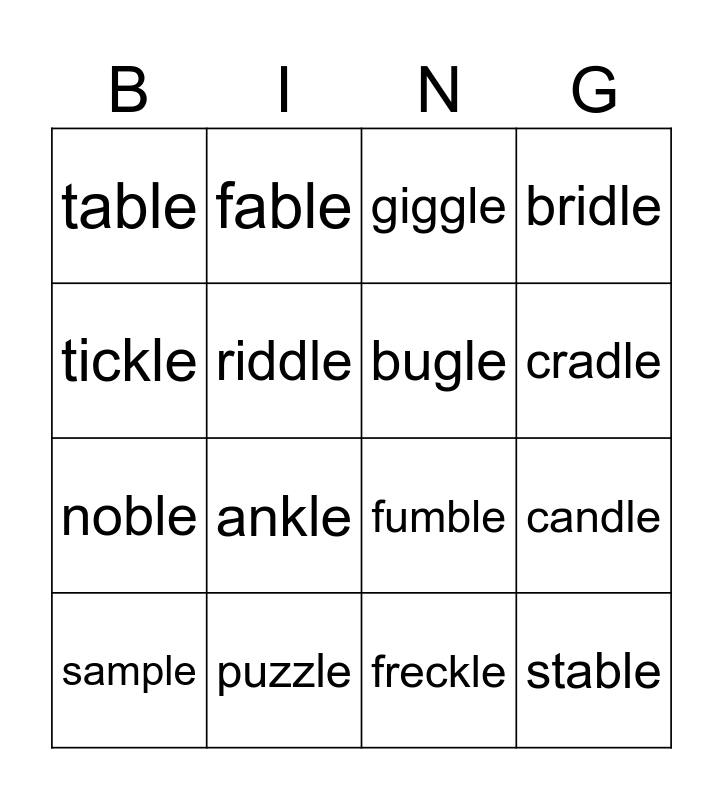 This bingo card has 16 words: puzzle, candle, giggle, table, noble, fable, fumble, freckle, tickle, riddle, sample, bridle, ankle, cradle, bugle and stable.