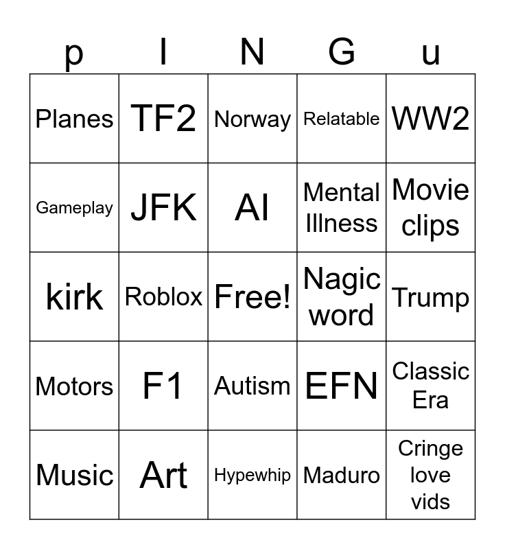 This bingo card has a free space and 24 words: F1, Art, AI, Music, WW2, Planes, Gameplay, TF2, Nagic word, Autism, Mental Illness, kirk, EFN, Classic Era, JFK, Maduro, Trump, Norway, Movie clips, Roblox, Cringe love vids, Motors, Relatable and Hypewhip.