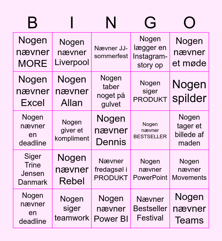 This bingo card has 51 words: Free!, Nogen nævner Dennis, Nogen siger “Det her smager virkelig godt”, Nogen nævner Power BI, Nogen nævner Rebel, Nogen siger skål, Nogen nævner Liverpool, Nogen nævner en leverandør, Nogen nævner Excel, Nogen starter en sætning med “Kan I huske dengang”, Nogen nævner Allan, Nogen lægger en Instagram-story op, Nogen nævner Movements, Nogen nævner PowerPoint, Nogen siger “jeg savner jer”, Nogen nævner en sælger eller “sælgerne”, Nogen taber noget på gulvet, Nogen nævner BESTSELLER, Nævner kanotur, Nogen nævner et møde, Nogen giver et kompliment, Nævner Bestseller Festival, Nogen nævner MORE, Nogen siger PRODUKT, Nævner Lars, Nogen nævner Teams, Nogen spilder, Nævner Bestseller-julefrokost, Nogen nævner en deadline, Nævner JJ-sommerfest, Nogen siger “vi burde gøre det her igen”, Nogen nævner Bestinfo, Nævner Lasse, Nogen går ud og ryger, Nogen nævner Barcelona, Nogen siger teamwork, Nogen spørger efter en oplader, Nogen nævner gala, Nogen siger “Det havde jeg glemt!”, Nævner Nikolaj, Nogen tager et billede af maden, Siger Trine Jensen Danmark, Nævner den tidligere julefrokost, Nogen nævner JYSK, Nævner John, Nogen nævner Blackbird, Nogen nævner en deadline, Nogen nævner Rebel, Nogen får tårer i øjnene af grin, Nævner fredagsøl i PRODUKT and “Vi skulle have gjort det her noget før”.