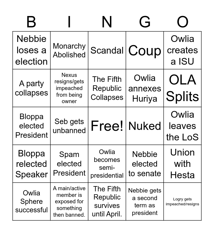 This bingo card has a free space and 24 words: Spam elected President, A main/active member is exposed for something then banned., The Fifth Republic Collapses, Owlia Sphere successful, Owlia creates a ISU, Nebbie loses a election, A party collapses, Monarchy Abolished, Nuked, Owlia becomes semi-presidential, Owlia annexes Huriya, Bloppa elected President, Nebbie elected to senate, Union with Hesta, Nexus resigns/gets impeached from being owner, Nebbie gets a second term as president, Owlia leaves the LoS, Scandal, OLA Splits, Seb gets unbanned, Logry gets impeached/resigns, Bloppa relected Speaker, Coup and The Fifth Republic survives until April..