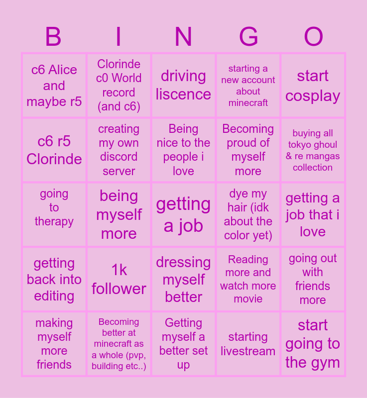 This bingo card has a free space and 24 words: 1k follower, Becoming better at minecraft as a whole (pvp, building etc..), Being nice to the people i love, making myself more friends, start cosplay, c6 Alice and maybe r5, c6 r5 Clorinde, Clorinde c0 World record (and c6), dye my hair (idk about the color yet), dressing myself better, Becoming proud of myself more, going to therapy, Reading more and watch more movie, going out with friends more, creating my own discord server, starting livestream, getting a job that i love, driving liscence, buying all tokyo ghoul & re mangas collection, being myself more, start going to the gym, getting back into editing, starting a new account about minecraft and Getting myself a better set up.