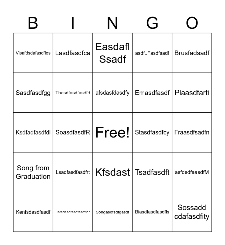 This bingo card has a free space and 24 words: Lsadfasdfasdfrt, Tsfadsadfasdfasdftor, afsdasfdasdfy, Kenfsdasdfasdf, Brusfadsadf, Visafdsdafasdfles, Sasdfasdfgg, Lasdfasdfca, Stasdfasdfcy, Kfsdast, Emasdfasdf, Ksdfadfasdfdi, Tsadfasdft, asfdsdfaasdfM, Thasdfasdfasdfd, Biasdfasdfasdfls, Fraasdfsadfn, Easdafl Ssadf, Plaasdfarti, SoasdfasdfR, Sossadd cdafasdfity, Song from Graduation, asdf..Fasdfsadf and Songasdfsdfgasdf.