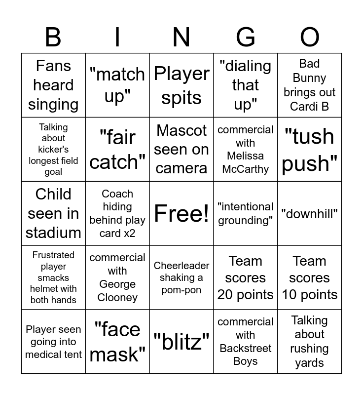 This bingo card has a free space and 57 words: "call on the field is under review", Player seen going into medical tent, "used his legs", Fans heard singing, "blitz", "situational football", "fair catch", Cheerleader doing a high kick, commercial with Melissa McCarthy, Helmet comes off on the field, "dialing that up", Blocked kick, "false start", Commentators talking to each other on camera during game, commercial with Bowen Yang, One-handed catch, Bad Bunny brings out Cardi B, Coach hiding behind play card x2, "tempo", Talking about rushing yards, "intentional grounding", commercial with Clydesdales, Team scores 20 points, Player spits, "surgical", Mascot seen on camera, "throws it away", Quarterback sack x2, "tush push", commercial with Ben Stiller & Benson Boone, Fan with painted face, Coach challenge, "twitchiness", Player drops the ball, "downhill", Talking about kicker's longest field goal, "Sweet Caroline" music with different words, Child seen in stadium, "the run game", Frustrated player smacks helmet with both hands, "match up", Cheerleader shaking a pom-pon, "and its good!" or "split the uprights!", Field goal or extra point miss, Team scores 17 points, Player drinks from water bottle, commercial with George Clooney, "face mask", "physicality", Ref breaks up fight on field, "off sides", commercial with Backstreet Boys, "explosive" or "explosion", "step up", "using his arm", Team scores 10 points and "shimmy".