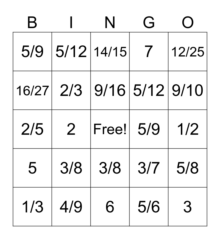 This bingo card has a free space and 24 words: 3/8, 4/9, 9/16, 1/3, 12/25, 5/9, 16/27, 5/12, 5/9, 3/8, 5/12, 2/5, 3/7, 5/8, 2/3, 5/6, 1/2, 14/15, 9/10, 2, 3, 5, 7 and 6.