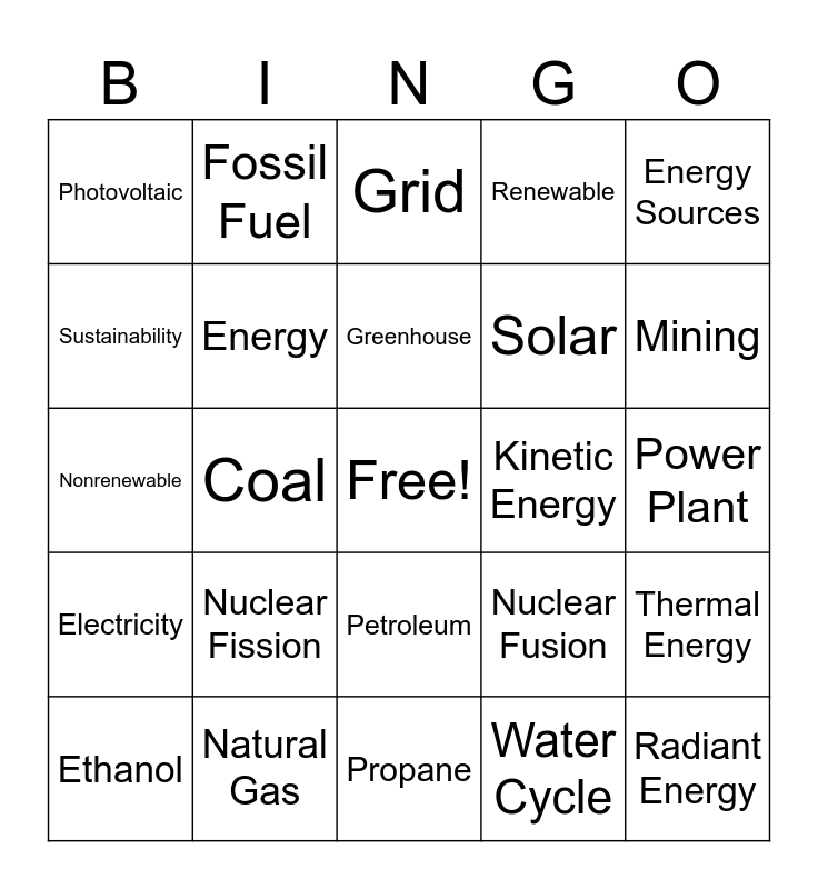 This bingo card has a free space and 33 words: Biomass, Carbon Footprint, Coal, Conservation, Electricity, Energy, Energy Sources, Ethanol, Fossil Fuel, Geothermal, Greenhouse, Grid, Hydrogen, Hydropower, Kinetic Energy, Mining, Natural Gas, Nonrenewable, Nuclear Fission, Nuclear Fusion, Petroleum, Photosynthesis, Photovoltaic, Power Plant, Propane, Radiant Energy, Renewable, Solar, Sustainability, Thermal Energy, Uranium, Water Cycle and Wind.