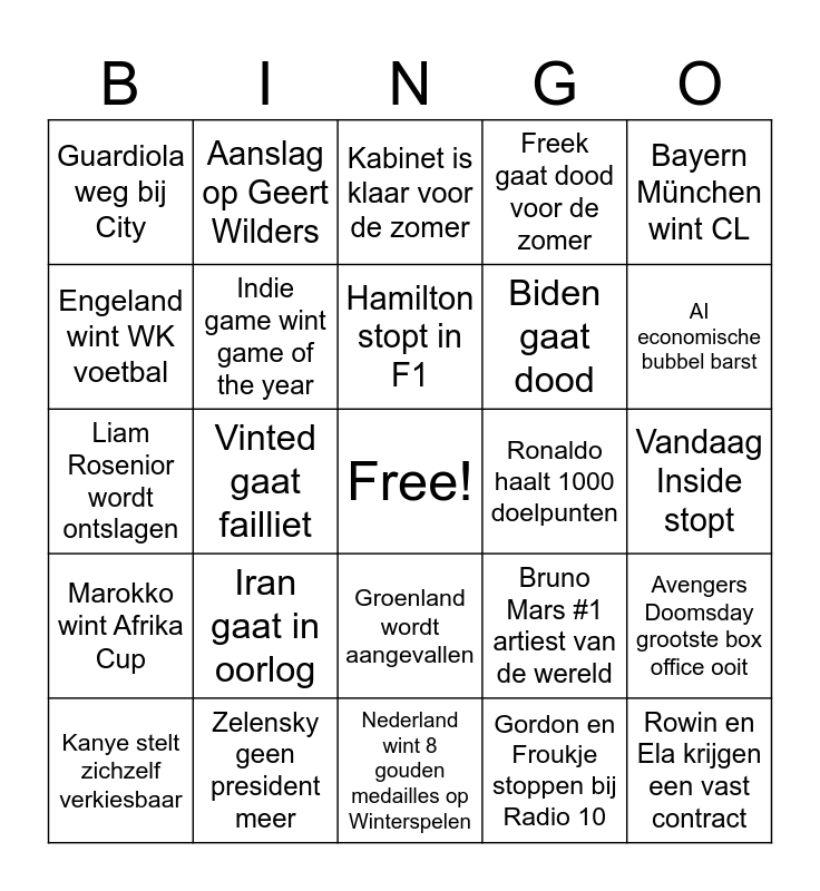 This bingo card has a free space and 24 words: Iran gaat in oorlog, Zelensky geen president meer, Hamilton stopt in F1, Kanye stelt zichzelf verkiesbaar, Bayern München wint CL, Guardiola weg bij City, Engeland wint WK voetbal, Aanslag op Geert Wilders, Ronaldo haalt 1000 doelpunten, Groenland wordt aangevallen, Biden gaat dood, Liam Rosenior wordt ontslagen, Bruno Mars #1 artiest van de wereld, Avengers Doomsday grootste box office ooit, Indie game wint game of the year, Gordon en Froukje stoppen bij Radio 10, Vandaag Inside stopt, Kabinet is klaar voor de zomer, AI economische bubbel barst, Vinted gaat failliet, Rowin en Ela krijgen een vast contract, Marokko wint Afrika Cup, Freek gaat dood voor de zomer and Nederland wint 8 gouden medailles op Winterspelen.