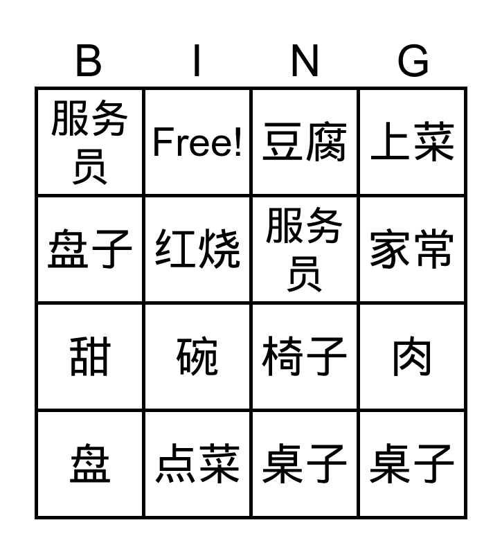 ⚠ This card has duplicate items: 桌子 (3), 服务员 (2), 素菜 (2), 点菜 (2)