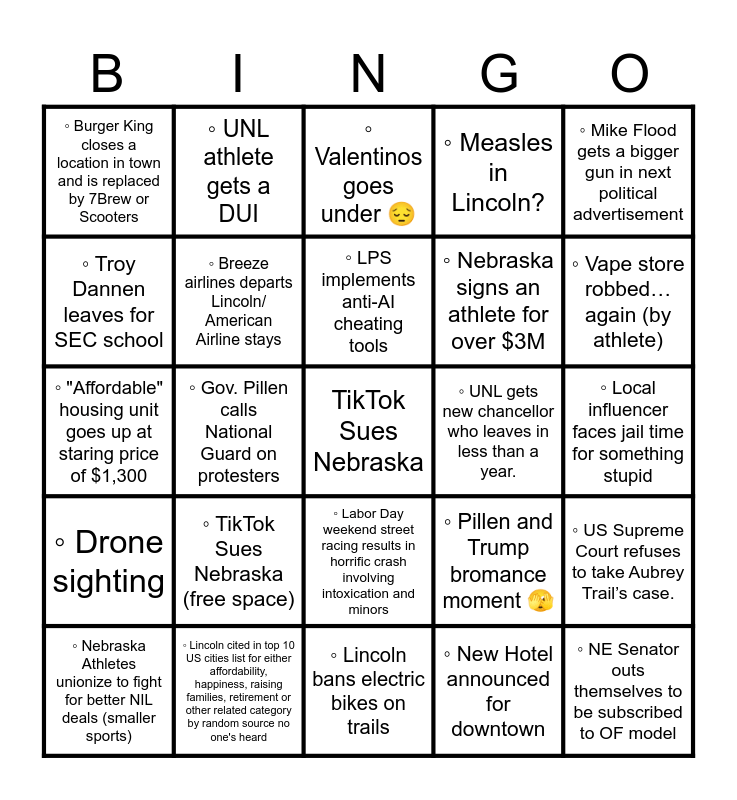 This bingo card has a free space and 52 words: Former Football player runs for office, ◦ TikTok Sues Nebraska (free space), ◦ Pillen says “we are doing this for the children”, ◦ New Hotel announced for downtown, ◦ Vape store robbed…again (by athlete), ◦ Protest is held on WEST steps of Capitol, ◦ UNL athlete gets a DUI, ◦ AG announces another lawsuit against Hemp sellers, ◦ Measles in Lincoln?, ◦ 7 Brew opens umpteenth store, ◦ Troy Dannen leaves for SEC school, ◦ Officer runs over a child…again, ◦ ICE raid in Crete, ◦ Pillen and Trump bromance moment 🫣, ◦ Pillen Farms claims another soul, ◦ Herbster runs for Gov. again, ◦ Gov. Pillen calls National Guard on protesters, ◦ Lincoln bans electric bikes on trails, ◦ Prager U is added to Nebraska Public Media, ◦ Mike Flood gets a bigger gun in next political advertisement, ◦ "Affordable" housing unit goes up at staring price of $1,300, ◦ Ricketts breaks spending record against Osborn, ◦ Valentinos goes under 😔, ◦ Nebraska signs an athlete for over $3M, ◦ Zaxbys opens Lincoln location, ◦ Nebraska Athletes unionize to fight for better NIL deals (smaller sports), ◦ "67" works its way into a stump speech, ◦ Chinese Spy balloon flies over Nebraska 🇨🇳, ◦ UNL gets new chancellor who leaves in less than a year., ◦ US Supreme Court refuses to take Aubrey Trail’s case., ◦ Credit card skimmer found on Pizzomatic machine, ◦ Breeze airlines departs Lincoln/ American Airline stays, ◦ Long John Silvers burns down in insurance scam., ◦ NE politician uses AI slop as part of election campaign, ◦ NE Senator outs themselves to be subscribed to OF model, ◦ Burger King closes a location in town and is replaced by 7Brew or Scooters, ◦ Another mediocre overpriced taco/burger joint opens in Lincoln, ◦ Breakfast Unhinged closes down and is replaced by another breakfast joint that goes under within 3 months, ◦ Quiche on 27th and O closes down and is replaced by a different ethnic restaurant, ◦ Heavy snowstorm causes public outrage from slow city cleanup efforts, ◦ Nebraska’s last second field goal loss to Iowa results in call for Coach Rhule resignation, ◦ Lincoln cited in top 10 US cities list for either affordability, happiness, raising families, retirement or other related category by random source no one's heard, ◦ Labor Day weekend street racing results in horrific crash involving intoxication and minors, ◦ Project O Street causes mass outrage and the closure of at least 2 businesses, ◦ Local influencer faces jail time for something stupid, ◦ After being finished, the Pershing mural is damaged by a storm, ◦ Wyuka Graveyard thief strikes again, ◦ LPS implements anti-AI cheating tools, ◦ Senior prank results in over $500,000 worth of damage., ◦ Pepe’s bistro closes/switches ownership, ◦ Drone sighting and ◦ Pillen/Hilgers/or Tom Osborne Blame Cheeba Hut for normalizing use of Electric Lettuce.