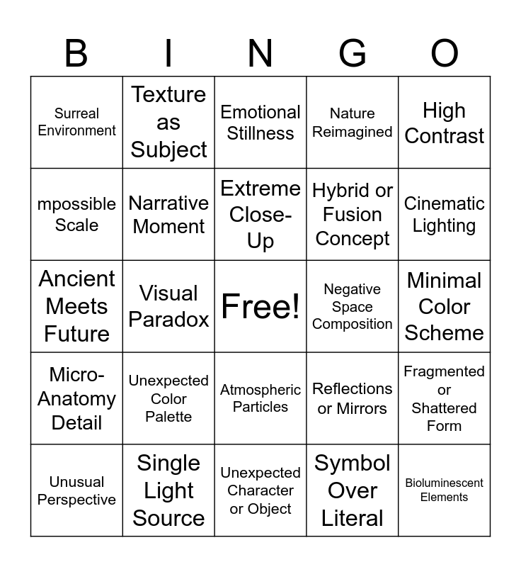 This bingo card has a free space and 24 words: Unexpected Color Palette, Single Light Source, Extreme Close-Up, Unusual Perspective, High Contrast, Surreal Environment, mpossible Scale, Texture as Subject, Negative Space Composition, Atmospheric Particles, Hybrid or Fusion Concept, Ancient Meets Future, Reflections or Mirrors, Fragmented or Shattered Form, Narrative Moment, Symbol Over Literal, Minimal Color Scheme, Emotional Stillness, Cinematic Lighting, Visual Paradox, Bioluminescent Elements, Micro-Anatomy Detail, Nature Reimagined and Unexpected Character or Object.