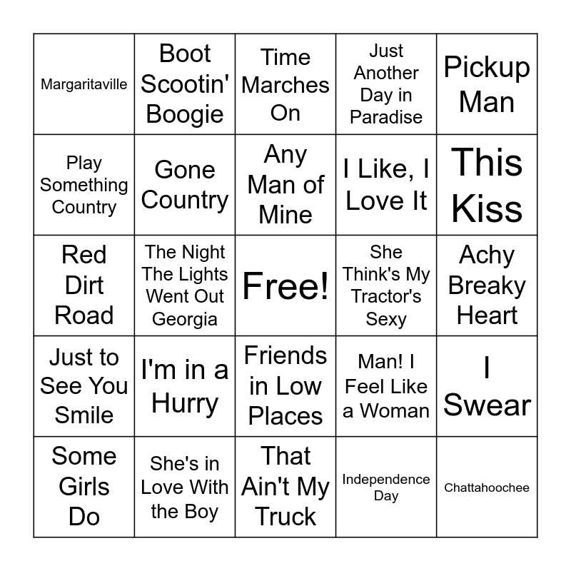 This bingo card has a free space and 42 words: Dust on the Bottle, Any Man of Mine, Brand New Man, I'm in a Hurry, Independence Day, I Swear, Chattahoochee, Cowboy Take Me Away, Time Marches On, Friends in Low Places, Achy Breaky Heart, This Kiss, The Night The Lights Went Out Georgia, Pickup Man, Write This Down, Man! I Feel Like a Woman, Something Like That, Red Dirt Road, My Maria, Boot Scootin' Boogie, Play Something Country, Rodeo, Callin' Baton Rouge, Margaritaville, Watermelon Crawl, Sold, I Like, I Love It, Goodbye Earl, The Devil Went Down to Georgia, Heads Carolina, Tails California, Check Yes or No, Just to See You Smile, Gone Country, That Ain't My Truck, Shouldv'e Been a Cowboy, Some Girls Do, She's in Love With the Boy, She Think's My Tractor's Sexy, John Deere Green, Bye-Bye, Just Another Day in Paradise and Red Ragtop.