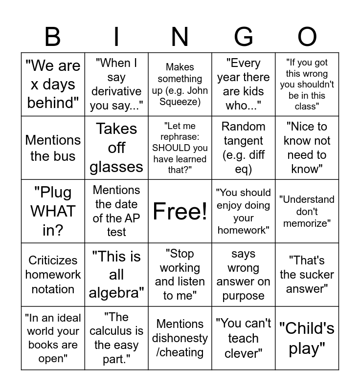 This bingo card has a free space and 24 words: "This is all algebra", "The calculus is the easy part.", "Let me rephrase: SHOULD you have learned that?", "In an ideal world your books are open", "If you got this wrong you shouldn't be in this class", "We are x days behind", Mentions the bus, "When I say derivative you say...", "You should enjoy doing your homework", "Stop working and listen to me", Random tangent (e.g. diff eq), "Plug WHAT in?, says wrong answer on purpose, "That's the sucker answer", Takes off glasses, "You can't teach clever", "Understand don't memorize", Makes something up (e.g. John Squeeze), "Nice to know not need to know", Mentions the date of the AP test, "Child's play", Criticizes homework notation, "Every year there are kids who..." and Mentions dishonesty /cheating.