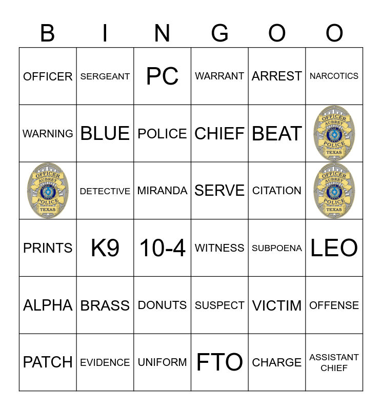This bingo card has 3 images and 33 words: SUSPECT, DONUTS, FTO, WARNING, PRINTS, SERVE, BLUE, UNIFORM, ARREST, VICTIM, WARRANT, OFFENSE, DETECTIVE, CHIEF, OFFICER, ALPHA, CITATION, PC, MIRANDA, K9, WITNESS, 10-4, SUBPOENA, SERGEANT, BEAT, EVIDENCE, POLICE, NARCOTICS, ASSISTANT CHIEF, PATCH, LEO, BRASS and CHARGE.