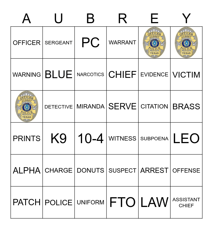 This bingo card has 3 images and 33 words: SUSPECT, DONUTS, FTO, WARNING, PRINTS, SERVE, BLUE, UNIFORM, ARREST, VICTIM, WARRANT, OFFENSE, DETECTIVE, CHIEF, OFFICER, ALPHA, CITATION, PC, MIRANDA, K9, WITNESS, 10-4, SUBPOENA, SERGEANT, EVIDENCE, POLICE, NARCOTICS, ASSISTANT CHIEF, PATCH, LEO, BRASS, CHARGE and LAW.
