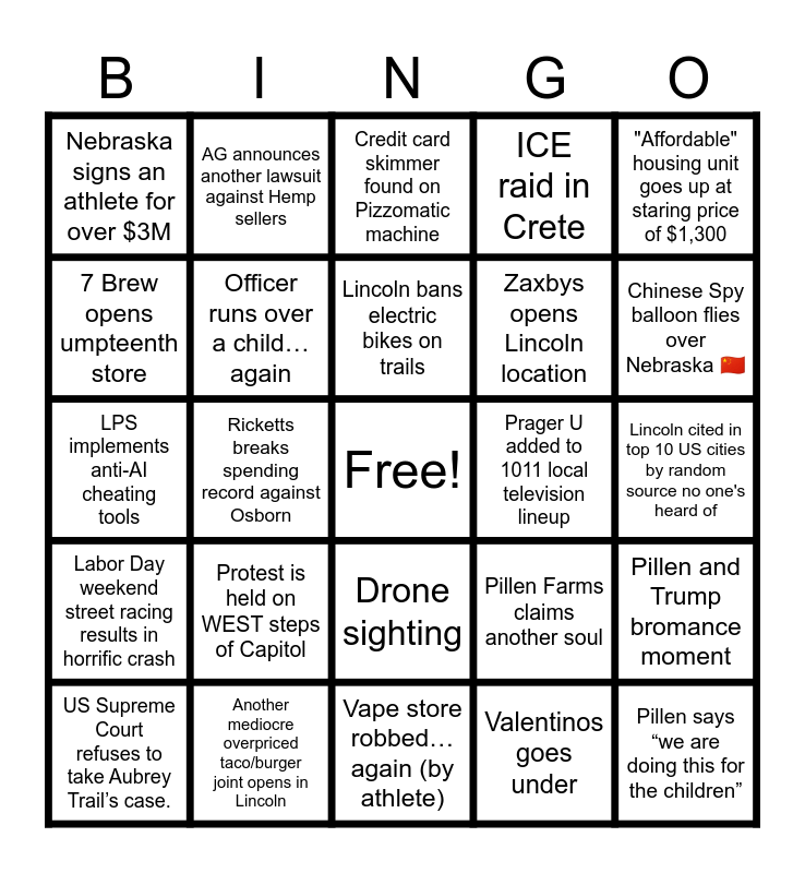 This bingo card has a free space and 51 words: Former Football player runs for office, Pillen says “we are doing this for the children”, New Hotel announced for downtown, Vape store robbed…again (by athlete), Protest is held on WEST steps of Capitol, UNL athlete gets a DUI, AG announces another lawsuit against Hemp sellers, Measles in Lincoln?, 7 Brew opens umpteenth store, Troy Dannen leaves for SEC school, Officer runs over a child…again, ICE raid in Crete, Pillen and Trump bromance moment, Pillen Farms claims another soul, Herbster runs for Gov. again, Gov. Pillen calls National Guard on protesters, Lincoln bans electric bikes on trails, Prager U added to 1011 local television lineup, Mike Flood gets a bigger gun in next political advertisement, "Affordable" housing unit goes up at staring price of $1,300, Ricketts breaks spending record against Osborn, Valentinos goes under, Nebraska signs an athlete for over $3M, Zaxbys opens Lincoln location, Nebraska Athletes unionize to fight for better NIL deals (smaller sports), "67" works its way into a stump speech, Chinese Spy balloon flies over Nebraska 🇨🇳, UNL gets new chancellor who leaves in less than a year., US Supreme Court refuses to take Aubrey Trail’s case., Credit card skimmer found on Pizzomatic machine, Breeze airlines departs Lincoln/ American Airline stays, Long John Silvers burns down in insurance scam., NE politician uses AI slop as part of election campaign, NE Senator outs themselves to be subscribed to OF model, Burger King closes a location in town and is replaced by 7Brew, Another mediocre overpriced taco/burger joint opens in Lincoln, Breakfast Unhinged closes and is replaced by another breakfast joint, Quiche on 27th and O closes and replaced by another ethnic restaurant, Heavy snowstorm causes public outrage from slow cleanup, last second field goal loss to Iowa causes Rhule's firing, Lincoln cited in top 10 US cities by random source no one's heard of, Labor Day weekend street racing results in horrific crash, Project O Street causes mass outrage and the closure of 2 businesses, Local influencer faces jail time for something stupid, After being finished, the Pershing mural is damaged by a storm, Wyuka Graveyard thief strikes again, LPS implements anti-AI cheating tools, Senior prank results in over $500,000 worth of damage., Pepe’s bistro closes/switches ownership, Drone sighting and Local leaders Blame Cheeba Hut for normalizing use of Weed.