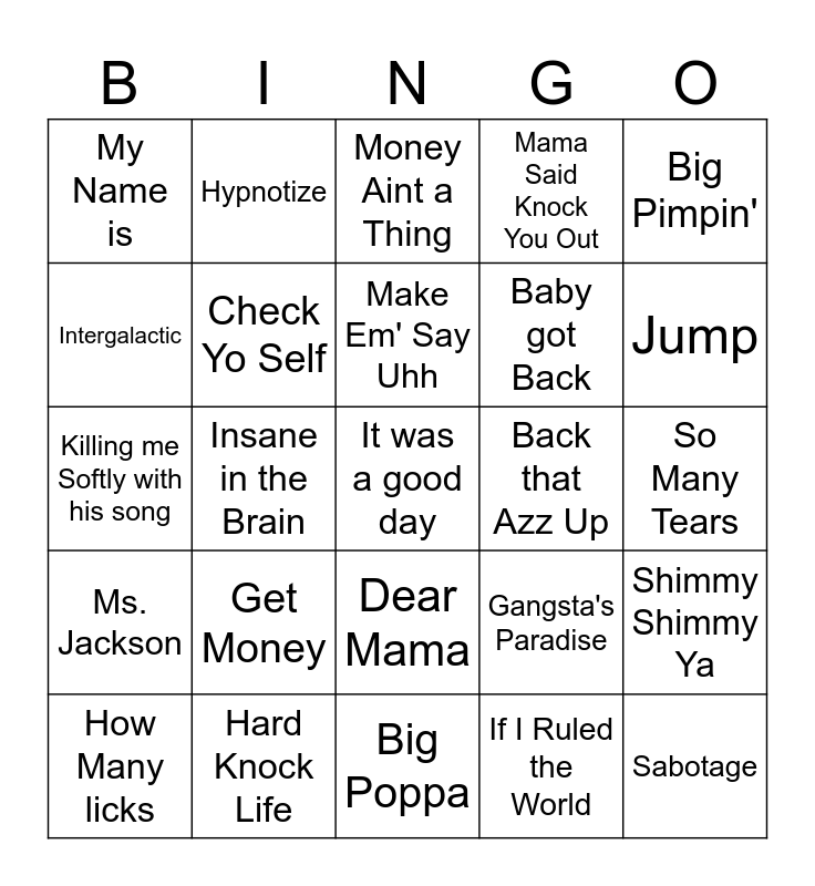 This bingo card has 52 words: Free!, It was a good day, Can I kick it?, Big Poppa, Get Money, I get around, Hypnotize, Work, Intergalactic, Hits from the Bong, Check Yo Self, Gin and Juice, Shimmy Shimmy Ya, Gangsta's Paradise, Still D.R.E., Ruff Ryders' Anthem, Make Em' Say Uhh, Back that Azz Up, Nothin" But a "G" Thang, Big Pimpin', Insane in the Brain, If I Ruled the World, My Name is, Baby got Back, Shoop, Sabotage, Doo Wop, Gettin' Jiggy Wit It, Jump, Keep Ya Head up, Whatta Man, Mama Said Knock You Out, Sock it to me, The Rain, Sound of da Police, Money Aint a Thing, Hard Knock Life, Can I get A..., In Da Club, Gold Digger, Work it, So Many Tears, Ms. Jackson, Rosa Parks, Dear Mama, Pass Da Blunt, Let me Blow your Mind, Killing me Softly with his song, Ready or Not, The Jump off, How Many licks and The Light.