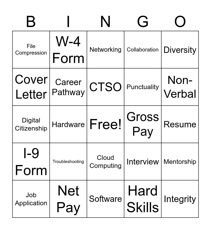 This bingo card has a free space and 35 words: Adaptability, Aptitude, Career Cluster, Career Pathway, Cloud Computing, Collaboration, Cover Letter, Credentials, CTSO, Cybersecurity, Digital Citizenship, Diversity, Entrepreneur, Ethics, File Compression, Gross Pay, Hard Skills, Hardware, I-9 Form, Integrity, Interview, Job Application, Mentorship, Net Pay, Networking, Non-Verbal, Portfolio, Professionalism, Punctuality, Resume, Soft Skills, Software, Troubleshooting, W-4 Form and Work Ethic.