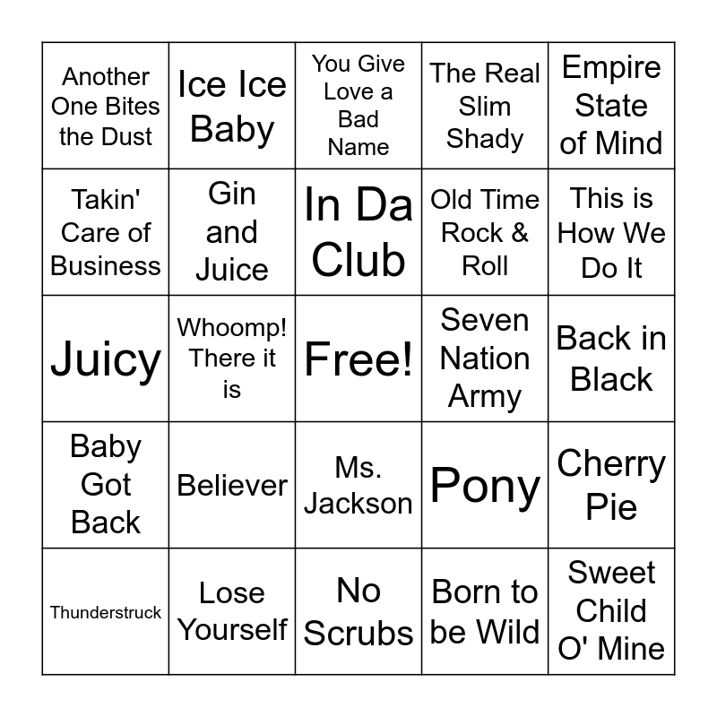 This bingo card has a free space and 40 words: Rapper's The Delight, Juicy, California Love, Gin and Juice, Lose Yourself, Ms. Jackson, In Da Club, Gold Digger, Empire State of Mind, Baby Got Back, Whoomp! There it is, The Real Slim Shady, Sweet Child O' Mine, Back in Black, Seven Nation Army, Believer, You Shook Me All Night Long, Another One Bites the Dust, We are the Champions, You Give Love a Bad Name, Cherry Pie, Born to be Wild, Old Time Rock & Roll, Takin' Care of Business, More than a Feeling, No Diggity, Poison, Say My Name, Yeah!, Ain't No Mountain High, I Love Rock 'N Roll, Thunderstruck, Jump Around, Pony, This is How We Do It, No Scrubs, Killing Me Softly With His Love, Black Betty, Ice Ice Baby and Shoop.