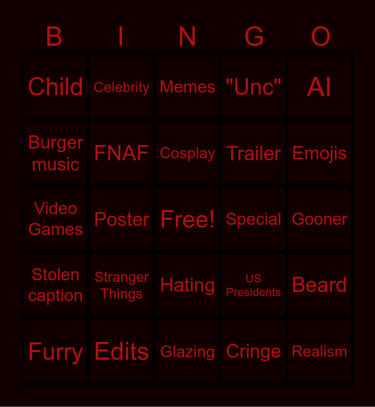 This bingo card has a free space and 24 words: Furry, Stranger Things, Cosplay, Cringe, AI, Child, Celebrity, Memes, Special, Gooner, Video Games, FNAF, US Presidents, Beard, Burger music, Edits, Glazing, "Unc", Emojis, Stolen caption, Poster, Hating, Trailer and Realism.