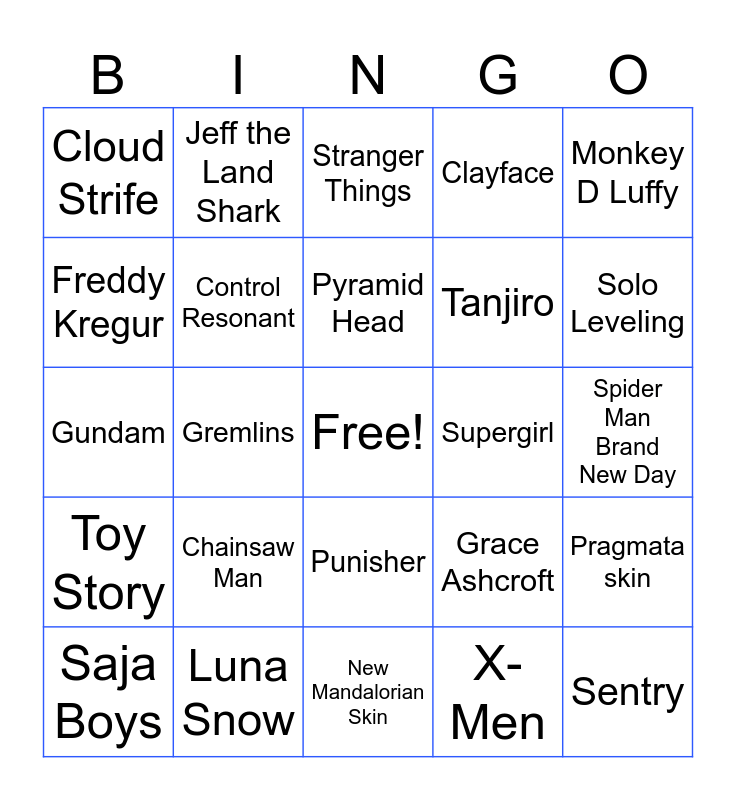 This bingo card has a free space and 24 words: Chainsaw Man, Luna Snow, Pyramid Head, Saja Boys, Monkey D Luffy, Cloud Strife, Freddy Kregur, Jeff the Land Shark, Supergirl, Punisher, Tanjiro, Gundam, Grace Ashcroft, Pragmata skin, Control Resonant, X-Men, Spider Man Brand New Day, Stranger Things, Solo Leveling, Gremlins, Sentry, Toy Story, Clayface and New Mandalorian Skin.