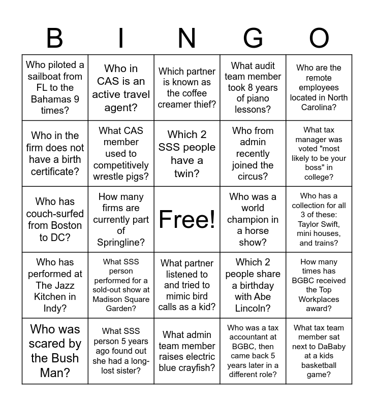 This bingo card has a free space and 24 words: What SSS person performed for a sold-out show at Madison Square Garden?, What SSS person 5 years ago found out she had a long-lost sister?, Which 2 SSS people have a twin?, Who was scared by the Bush Man?, Who are the remote employees located in North Carolina?, Who piloted a sailboat from FL to the Bahamas 9 times?, Who in the firm does not have a birth certificate?, Who in CAS is an active travel agent?, Who was a world champion in a horse show?, What partner listened to and tried to mimic bird calls as a kid?, Who from admin recently joined the circus?, Who has couch-surfed from Boston to DC?, Which 2 people share a birthday with Abe Lincoln?, How many times has BGBC received the Top Workplaces award?, What CAS member used to competitively wrestle pigs?, Who was a tax accountant at BGBC, then came back 5 years later in a different role?, Who has a collection for all 3 of these: Taylor Swift, mini houses, and trains?, Which partner is known as the coffee creamer thief?, What tax manager was voted "most likely to be your boss" in college?, How many firms are currently part of Springline?, What tax team member sat next to DaBaby at a kids basketball game?, Who has performed at The Jazz Kitchen in Indy?, What audit team member took 8 years of piano lessons? and What admin team member raises electric blue crayfish?.